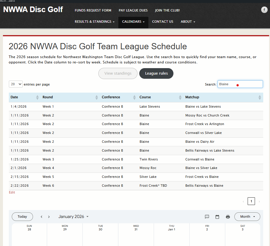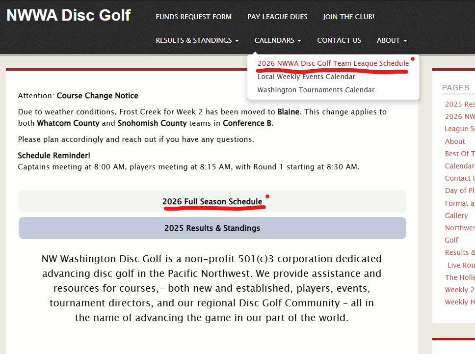 Step 1: Hover over the Calendars button in the navigation menu, then click on 2026 NWWA Team Disc Golf League Schedule. Alternatively, you can click the button on the Leagues home page.